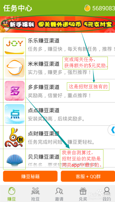 方法:进入赚豆页面, 从上到下有乐乐、米米、多多、点点、点财、贝贝渠道。