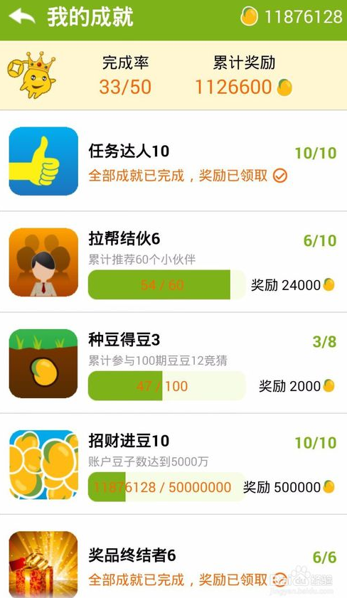 方法:只要达到对应的成就,就可以直接领取豆子奖励。一共有5种成就,分别是:任务达人、拉帮结伙、种豆得豆、招财进豆、奖品终结者。成就送豆纯属白送,不要白不要呢。这个是招财豆独有的,别的app没有。
