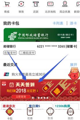 2、打开云闪付,点击【卡包】下方轮播图“天天签到”进入签到领取红包,红包金额随机,最高2018元;