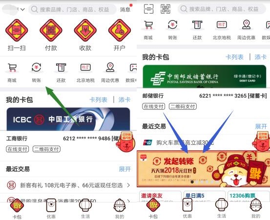 3、点击【卡包】-【转账】给自己其它银行卡或亲朋友好友转账2元,转账后再点击轮播图“发起转账”进入抽红包,金额随机,最高2018元;