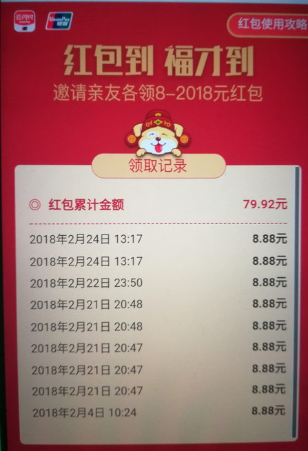 云闪付的新年活动,新老用户都可以参与,每天签到,转账一笔各获得一个随机红包,最高2018元,每天都可以领,红包在云闪付充话费,水电煤缴费可抵现,也可以在京东、1号店、国美等购物抵现。