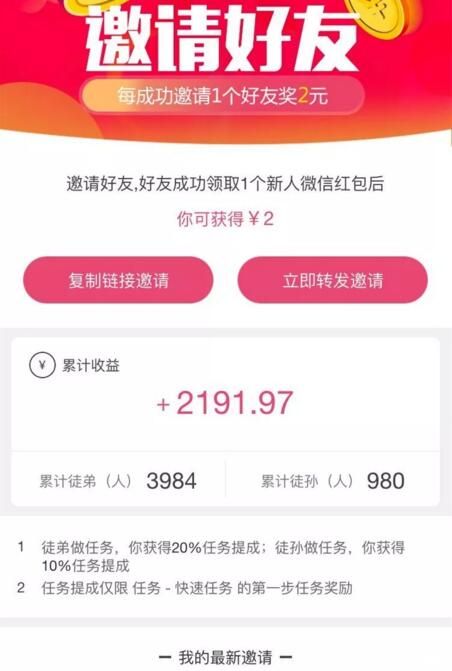 收徒赚钱:有效用户通过你的专属链接注册即可获得2元现金奖励,同时可以获得徒弟体验广告的收益的20% 徒孙体验广告收益的10%奖励。