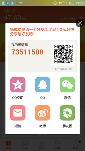 邀请一个人2元 满15人就可以换Q币 或话费了