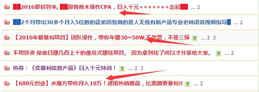 新人们,这些日入千元,月入10万,年赚30~50W不是你们那么容易做的,因为你做了也不一定能达到宣传的效果,还可能被忽悠到最后喝西北风。如果你们不信,自己有空可以去一些网赚论坛点击看看。这些帖子点进去基本都是让你支付几百块然后他们教你如何赚钱或者如何推广产品等等。细心想想就很清楚,交个几百块就能够轻松实现日入千元,月入万元。如果真这么好赚的话,为什么这些人不自己默默的赚钱,而是以几百块的低价出售给你呢?或者是收取几千甚至上万的培训费呢?答案很简单:忽悠小白。总之,就是只要是要自己掏腰包事情一定要冷静思考自己掏出去的钱能不能通过这个项目赚回来。让你交几百块就带你入几百、几千甚至上万,这些基本都有忽悠成分。