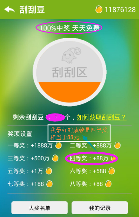 方法:今日签到、体验一个任务、邀请一位好友,都可免费获赠一颗刮刮豆。一等奖可直接获得1888元,二等奖888元,三等奖500元,四等奖88元,五等奖1元。