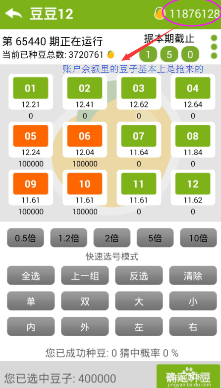 方法:豆豆12是一个“种豆得豆”的简单有趣的数字竞猜游戏,系统每3分钟运行一期,每期系统从1-12这12个数字中随机选择一个数字作为收豆结果。每个数字出现的几率均等,均为1/12。每个人每期可以在一个或者多个数字上种任意数量的豆子,猜中即可“收豆”,猜不中则失去豆子,失去的这部分豆子被其他猜中结果的豆友收走。通过豆豆12赚豆子的亲们可谓是惊心动魄,但却能赚更多哦!