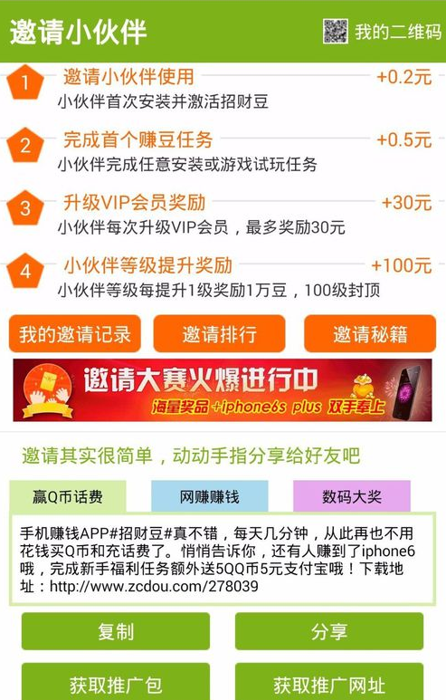 方法:邀请页面,每位豆友豆友自己的推广网址,只要把这个地址推荐给好友,好友通过链接首次下载安装了,就能够获得2000豆子,好友完成任意渠道任务,就能获得5000豆子,小伙伴无论是签到、体验渠道任务,还是邀请好友都能获得积分,积分到了一定程度就能升级,小伙伴每提升一级,您就可以获得10000豆子奖励。另外小伙伴每次升级vip会员,最多给您奖励30元。