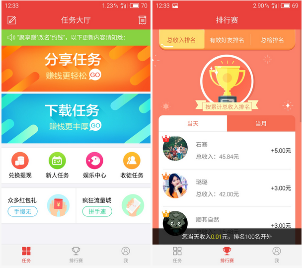 装了新版聚享赚(约钱),第一感觉就是主页有点少内容,毕竟是新软件嘛,可以理解,不过任务还是继承了聚享赚app的任务。