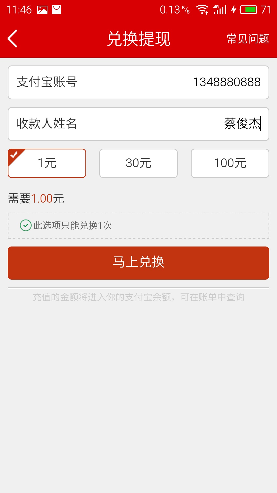 4、一元额度只能兑换提现一次,其它额度无限制;