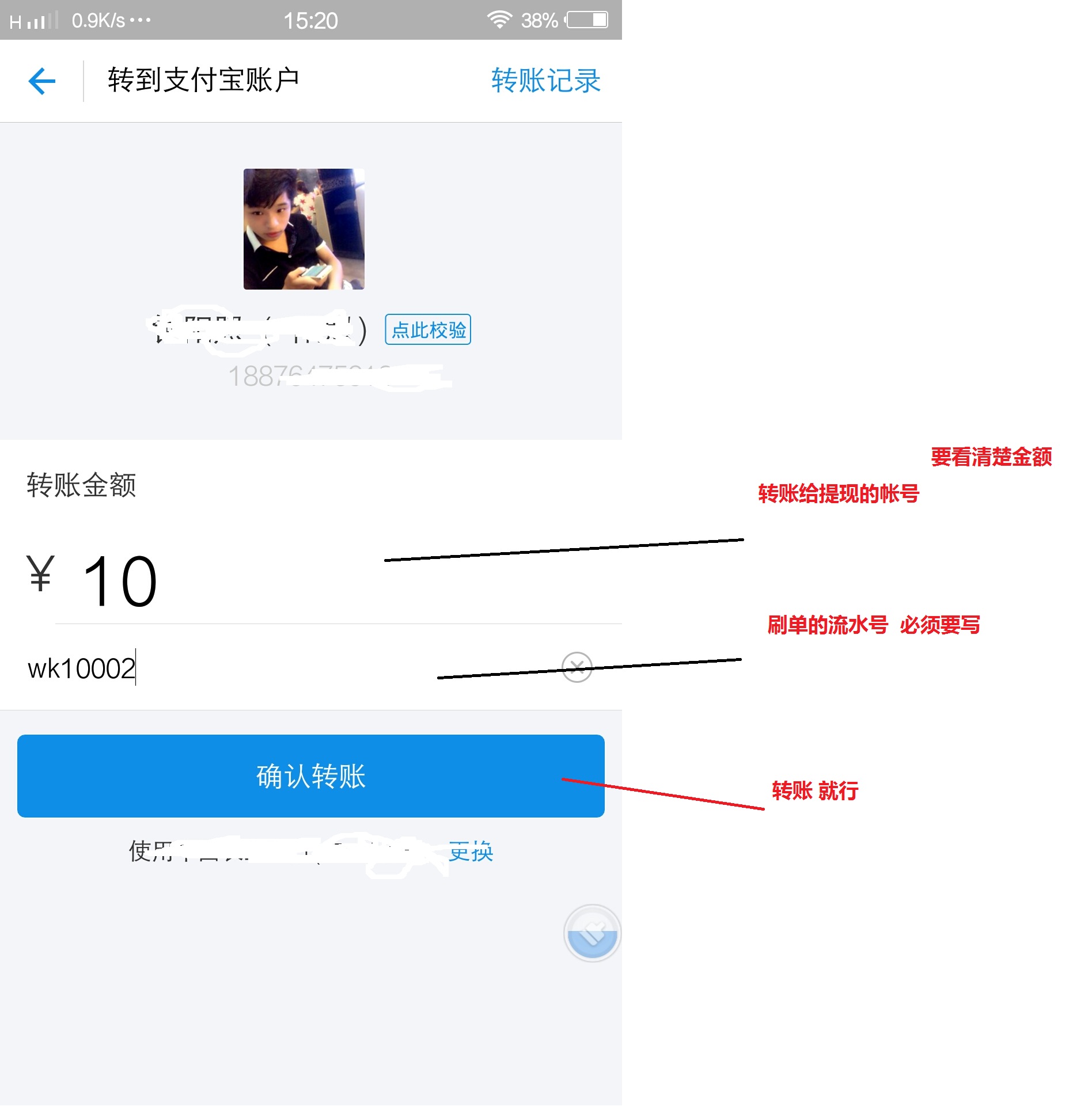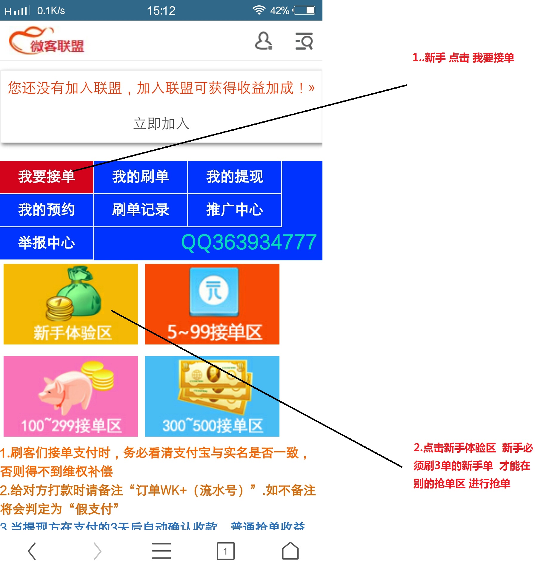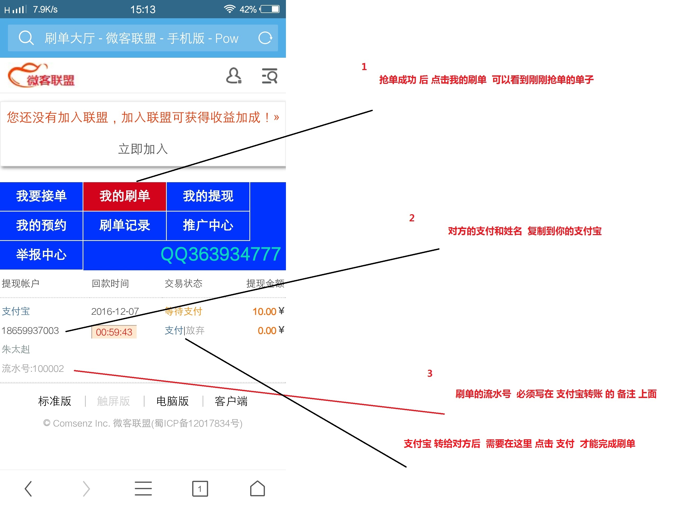 2.新手 流程 就是 进刷单大厅 点击我要接单 抢单 然后用支付宝转账给提现的对方 备注要写wk 流水号 转账成功后 在我的刷单 点击刚刚抢单的单子 点击我已支付 刷单完成