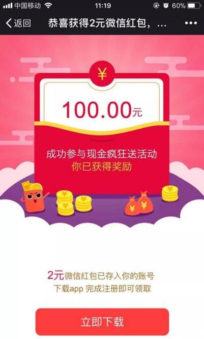 1、微信扫描下面二维码进入活动页面,领取随机金额的微信红包,必须扫描下面的二维码才有红包,一般都是1~2元,然后按照提示下载APP;