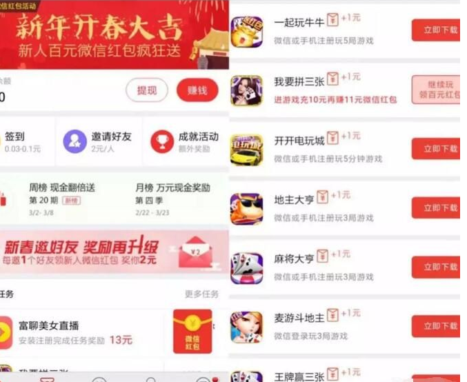 点击主页横幅广告位进入微信红包页面现在好像有 8,9个1元微信红包我体验了下一个微信红包任务大概3-5分钟基本就是玩几局棋牌游戏,还是非常快的。