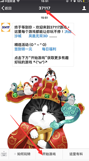 1、关注【37117】公众号、点击下方【开始游戏】按钮具体签到步骤如下: