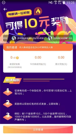 邀请好友赚钱:每邀请一个好友奖励1元,好友每做1个任务再奖励你1元,最高可得10元,邀请好友上不封顶哦!邀请好友多的用户可月入过万!