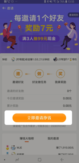 点击“立即邀请挣钱“,将次页面发给好友,当好友试玩里面的游戏之后,你将获得最高7元的奖励(系统自动发放红包)。
