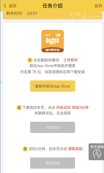 在app store里面复制关键词,找到这个软件下载,按照前面的步骤一步一步来,下载完以后点开软件试玩3分钟,即可退出,奖励会自动打到你的账户里,可以提现到微信上。