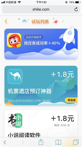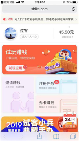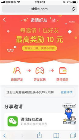 试玩赚钱,把邀请链接//shike.com/i/UTfIzBE发送到微信等等好友,注册应用,奖励丰富,利润高,好友试玩,获得奖励,每邀请1位好友最高奖励10元,赶快邀请好友一起加入试客小兵,一起赚嗨天!