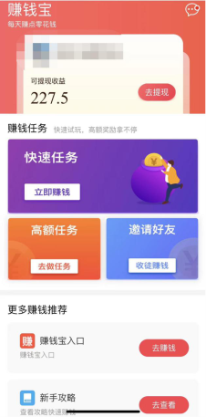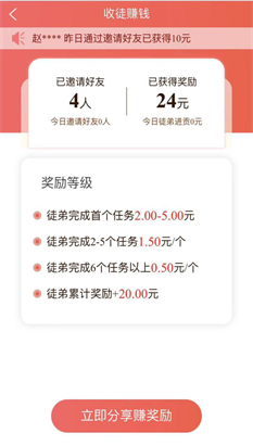 “赚钱宝”的收徒机制,邀请好友一起赚钱,1人做任务,2个人有收益。徒弟越多收益越多。