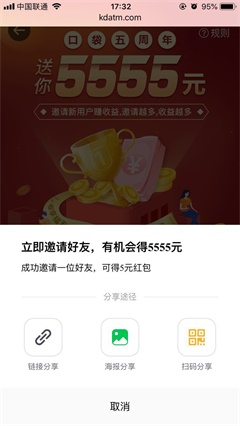 下载完成后,点击:邀请新用户即可看到好友数量以及昨日收徒情况、收益情况。下拉即可看到5555元现金活动排行榜内容,即可了解你与5555元现金的距离。点击邀请好友按钮即可选择“链接、海报或者二维码”赚钱。