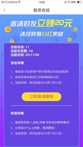 4.高额悬赏:三天内收徒15位用户,并完成任务数≥20(师傅和徒弟做的任务都算),可获得20元现金奖励。