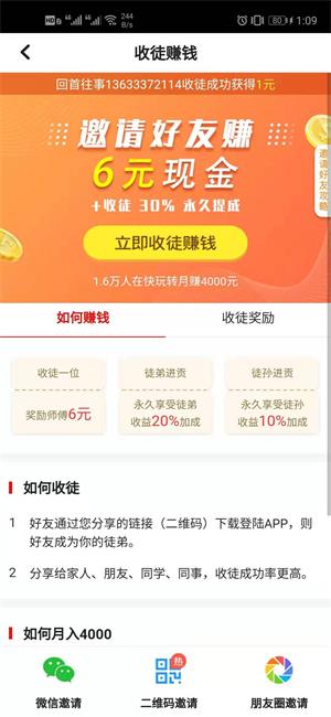还可以邀请好友来一起转发。每邀一个好友可享两级好友30%的收益分成。收徒可获得最高5元奖励,感兴趣的好友们赶快来轻松赚。你来转发就有钱赚。