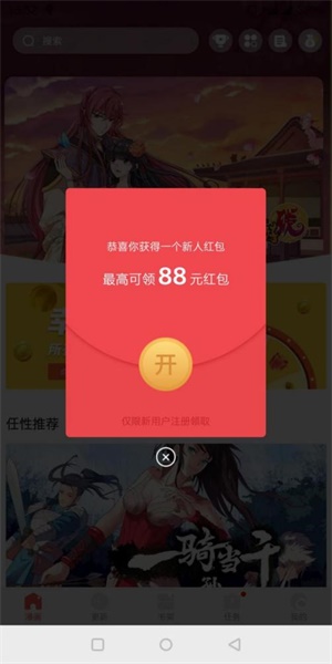 凡是成功注册成为抖腿漫画APP的新用户,最高可获88元的现金红包奖励。