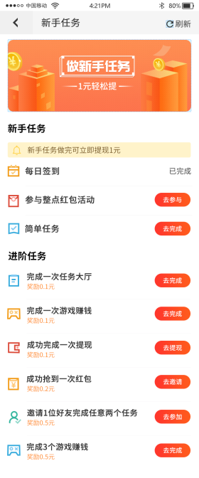 首先新用户进来,可以有一次一元提现的机会,简单完成一个20秒左右的新手任务,这个钱就是你的了。然后你可以去进行提现,提现的前提是你需要关注下他家的公众号以及做一个任务就可以了,微信秒到账。