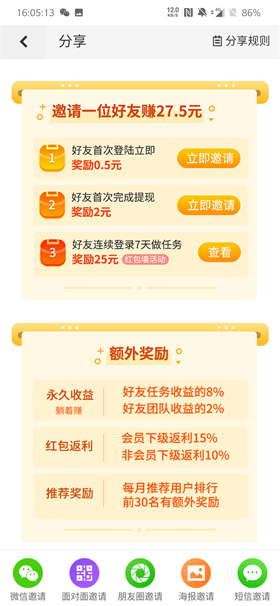 另外他家邀请徒弟还跟抢红包有关。师父邀请徒弟,徒弟完成首次提现,师父就可以返2块,前100名注册登录的,师父还可以额外获得50元。另外所有徒弟抢红包的收入,师父都可以获得红包金额10%-15%的额外返利,徒弟做任务还有8% 2%的返利。这么算来的话,只要徒弟做任务,我会有任务返利,徒弟做任务获得红包券,拿红包券抢到红包,我还有返利,一个任务,双重返利,岂不美哉。