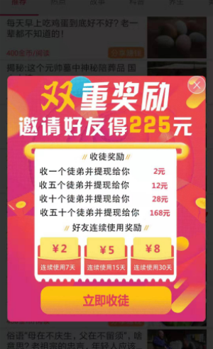 特好赚app平台最低2元就可以提现的超低门槛得提现方式,0扣量,加上额外平台推出的收徒数量奖励和签到奖励,最高可达领取225元。而且还有20%的徒弟和10%的徒孙分红。只要你的徒弟徒孙多,你就可以轻松月薪过万。