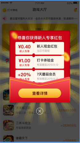 1、新手注册即送0.4元 1元打卡体验金 蘑菇会员(奖励加成20%),福利多多