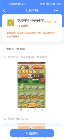 1,下载注册打开大厅,你就可以看到许多试玩任务,点击今日优选,进入后你就可以看到很多试玩任务,单价还挺高的,然后就可以点击开始赚钱,下载App,看下图:1,微信登入,把恐龙合成6级很简单完成的,记得截图2,查找自己的师傅,截图,最后一步把截图填上,填上自己的信息,注意:绑定设备信息才能试玩赚钱