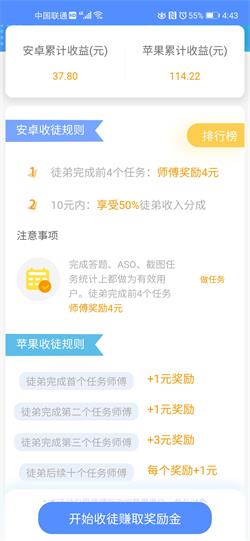 2,平台还可以邀请赚钱,把这款App推广给自己的好友,徒弟完成4个任务:师傅奖励4元,10元内:享受50%徒弟收入分成,徒弟每天试玩赚钱,师傅在家躺着赚,邀请收徒收益很高哦