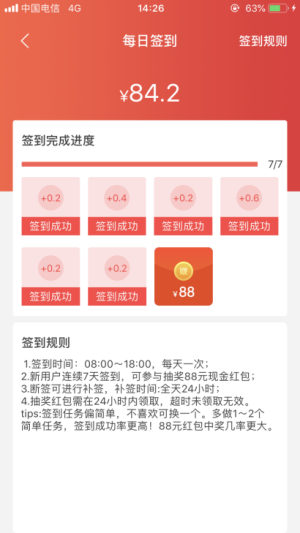 每天签到有现金奖励,签到7天可抽88元现金红包。