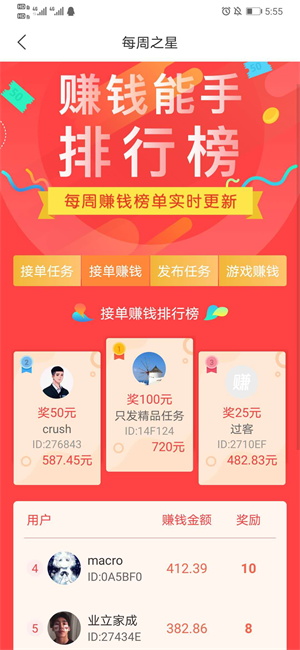 接单、发单、玩游戏排行榜每周现金奖励,每周可拿100元榜单排名奖励;