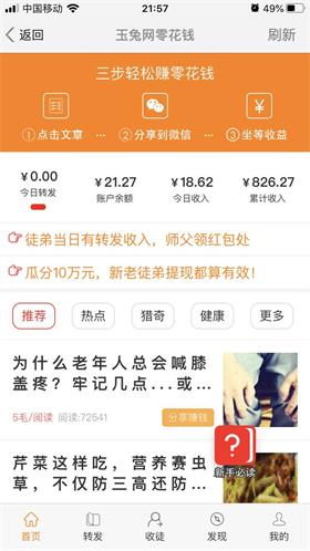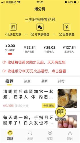这两款转发赚钱平台比较独特,新型奖励机制,单价高达0.5~0.6元,疯狂涨分,同时还开启瓜分10~30万收徒现金奖励活动,不一样的是徒弟转发文章有收益或每天登陆,师傅就有红包领,每天领红包领到手软,超级爽歪歪。不信你也下载来试试!