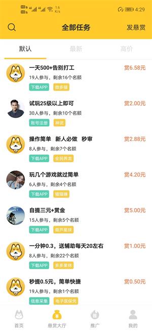 1, 任务丰富,拥有多种任务模式,如关注,阅读,转发,下载试玩等等,悬赏任务一般可以赚几毛到几十块都有