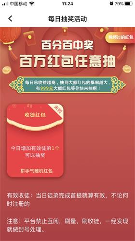 每天要记得来抽红包哦!(需要手动领取)收徒越多奖励就越多,还有大包999元抽不停歇!
