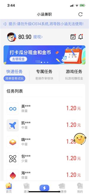 小涵赚钱ios一款苹果试玩赚钱App,大厅超多任务,任务单价1-10元,(快速任务 高额任务)任务简单,一个任务大概试玩3分钟即可领取奖励,满10元即可提现,下午3点之后任务量多,小伙伴们赶快下载试玩吧!