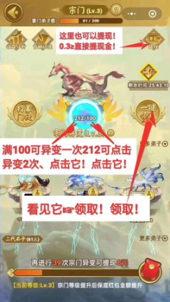 (注:提现是两个板块【元宝兑换】和【宗门异变】,我们着重说的是【宗门异变】,持久收益板块,这个板块永久0.3元提现,不要因为元宝兑换提现门槛高就退缩了哦。)