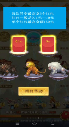 (2)宗门变异次数,以后每满50次可领取一次保底红包最低5元,根据宗门级别对应最低5、6、8、10、20、30、40、50元保底红包(这也是必得的)。注:这里有个新手奖励,50次异变之前会有1、3、10次等不同级别的变异次数保底红包。