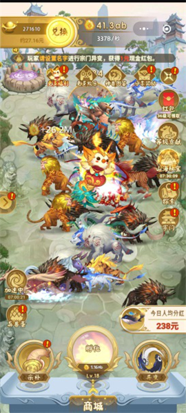 神兽分红是最吸引人的设定之一,获得了对应的神兽,可享受平台的分红,有永久和限时天数之分。神兽分四种:“神兽鸿鹄”每天分红10元现金红包,“神兽青鸾”每天分红20元现金红包,“神兽凤凰”每天分红50元现金红包,“神兽鲲”每天按广告收益比例分红,目前每天分红200元左右。