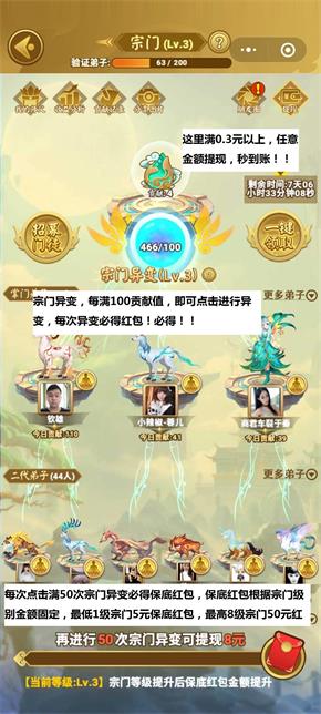 宗门贡献值异变版块。贡献值,就是通过看视频广告增加宗门贡献值,每次满100贡献值,就可以进行一次宗门异变,每次宗门异变必得红包!!!这也是我们个人玩家可收益的点,我们只要看视频就能产生贡献值的,100贡献值进行异变100%有红包。