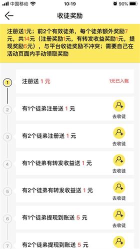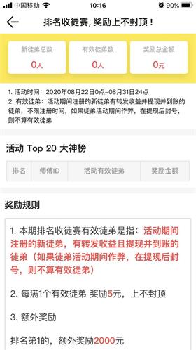 随手旗下梅花网,新手红包共15元:注册送1元;前2个有效徒弟,每个徒弟额外奖励7元,共14元(注册奖励1元,有转发收益奖励1送,提现奖励5元),与平台收徒奖励不冲突;需要自己在活动页面内手动领取奖励。还有不定期举行的排名收徒赛活动。