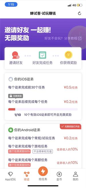 师徒赚钱:【邀请好友-好友完成任务-你获得奖励】把你的邀请链接发给亲朋好友,好友下载注册后就算是你的徒弟了,徒弟每完成一个任务师傅都可以获得奖励,徒弟完成前两个任务奖励两元,邀请徒弟还能在家躺着赚钱,如果你也想要躺着赚赶快下载蝉试客,邀请你的亲朋好友一起试玩吧!