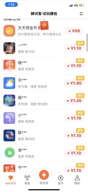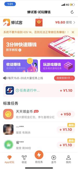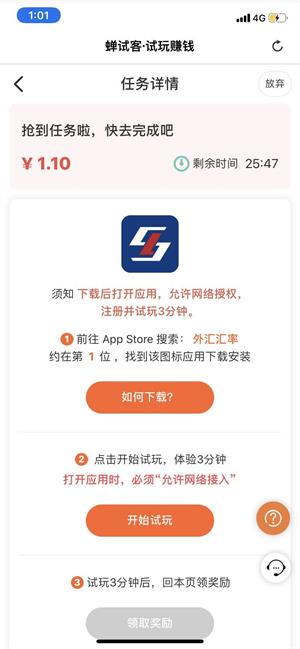 试玩任务:打开主页有许多试玩任务,点击抢任务,平台会自动为你匹配新任务,如下图:任务单价1.10元,首先下载后打开应用,注册并试玩3分钟后,即可返回页面领取奖励,必须在30分钟之内完成,不然任务会被取消。
