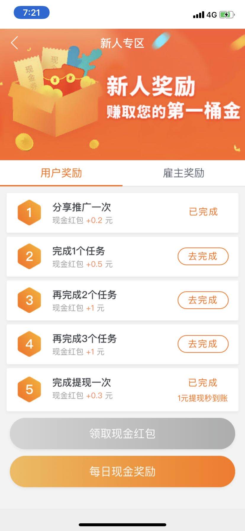 报名领取任务-上传任务截图-领取赏金奖励)做完任务即可领取奖励,支持1元提现,小编建议你以注册类任务为主试玩,注册任务单价高,操作简单,赚钱快