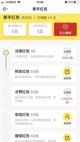 1.新手红包35元;(注册1元,转发红包0.5;收徒红包0.5;提现红包0.5;转发满10/100/200送2/10/20元,首次点赞奖励0.5)