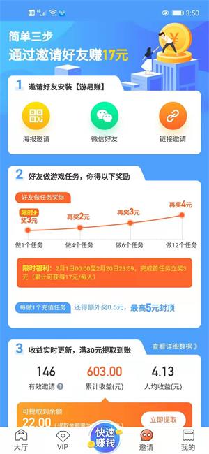 邀请赚钱:新人注册送一元,限时福利通过邀请好友赚钱17元,完成一个任务奖励三元,以此类推完成12个任务即可领取17元,别看12个任务很多其实很简单,在大厅挑一些价格低的试玩,大概一个任务2分钟即可完成,赶快去推广给你的好友吧!