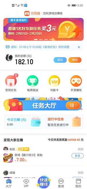游易赚是款主打游戏赚钱平台,这款平台开放了许久,很多普通玩家一天可以赚100 ,游易赚主页有海量任务,每天更新大量试玩任务不怕你不够试玩,大厅还有抽奖,签到红包等福利,适合自由职业,学生党下载注册试玩,免费领取越玩越有钱,一款游戏试玩赚钱神器,小白也能小赚70 收入十分可观!