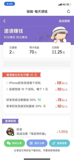 邀请赚钱:平台邀请每位好友可获得35元,好友下载试玩任务三分钟,即可获得10元奖励,想要赚钱的朋友,动动发财的小手拉亲朋好友一起赚钱,好友完成任务获得佣金,邀请的越多赚得越多,